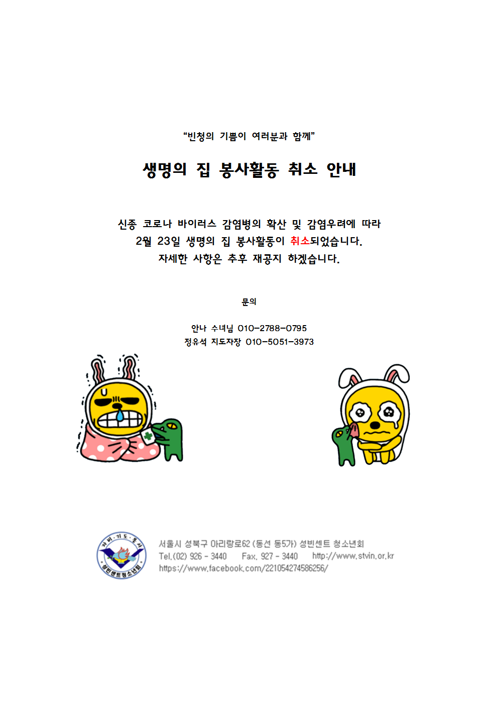 2020년 2월 23일 생명의 집 봉사활동 취소 안내